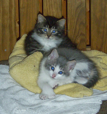 They are getting fuzzier and fatter by the day. Their rescuers/foster home, who will be keeping their feral mom, have named them Billy (the fuzzy one) and Agnes. I think Agnes may become "Aggie" when marketed for adoption.